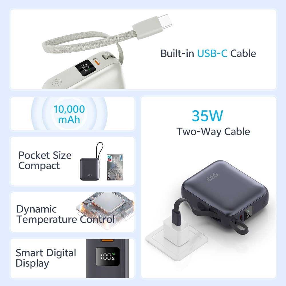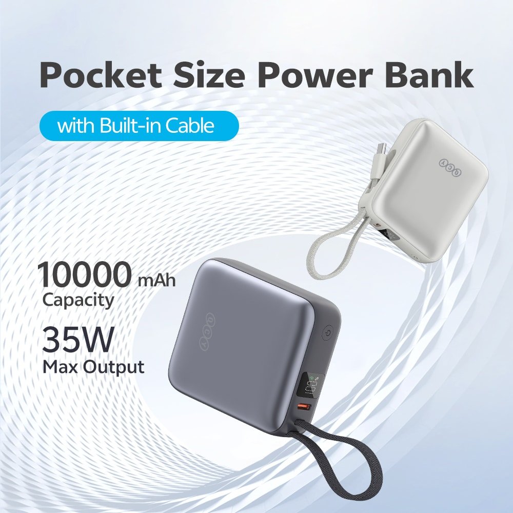 The QCY PB10C 10000mAh 35W PD Mini Power Bank is a compact and portable charger with fast 35W Power Delivery, a built-in USB-C cable, and a smart digital display—perfect for quickly charging phones, tablets, and other devices on the go with safe and efficient performance.