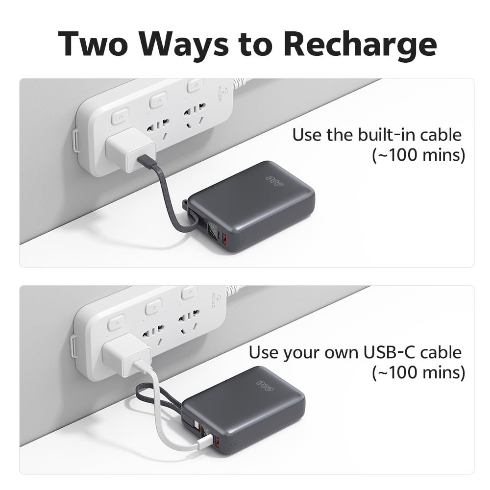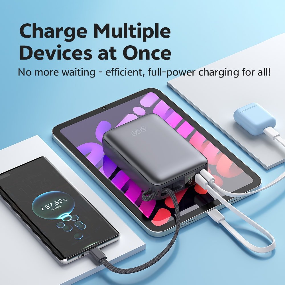 The QCY PB20A 45W PD 20000mAh Fast Charge Power Bank is a high-capacity portable charger designed for fast and efficient charging. It features a 20000mAh battery with 45W Power Delivery (PD) output, allowing it to quickly charge smartphones, tablets, and even some laptops. It comes with a built-in USB-C cable, multiple ports for charging several devices at once, and a digital display to show battery level. With fast input support, it can recharge itself in about 1 hour 40 minutes, making it ideal for travel and daily use.