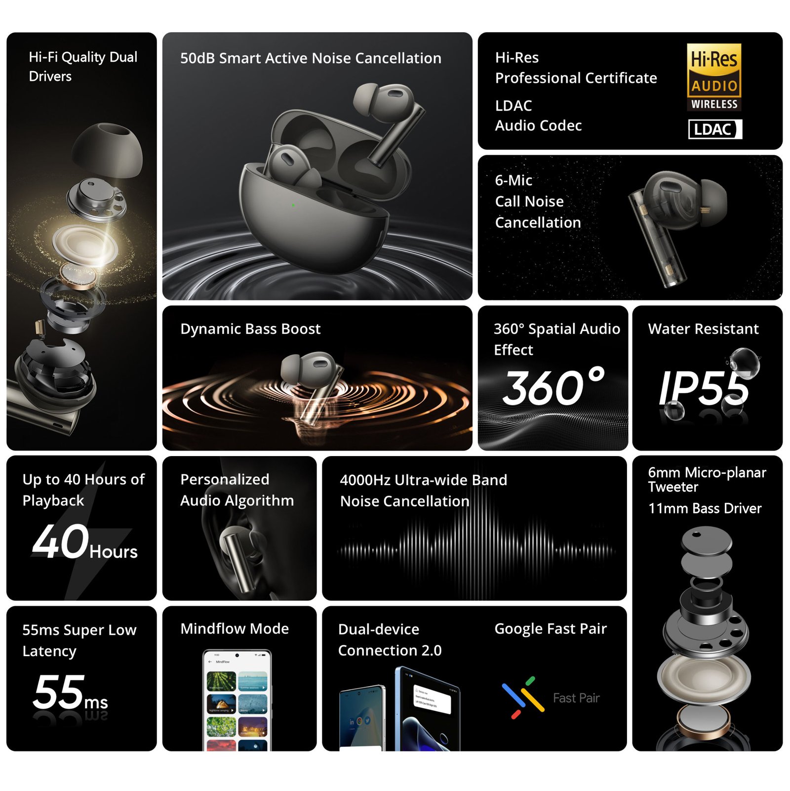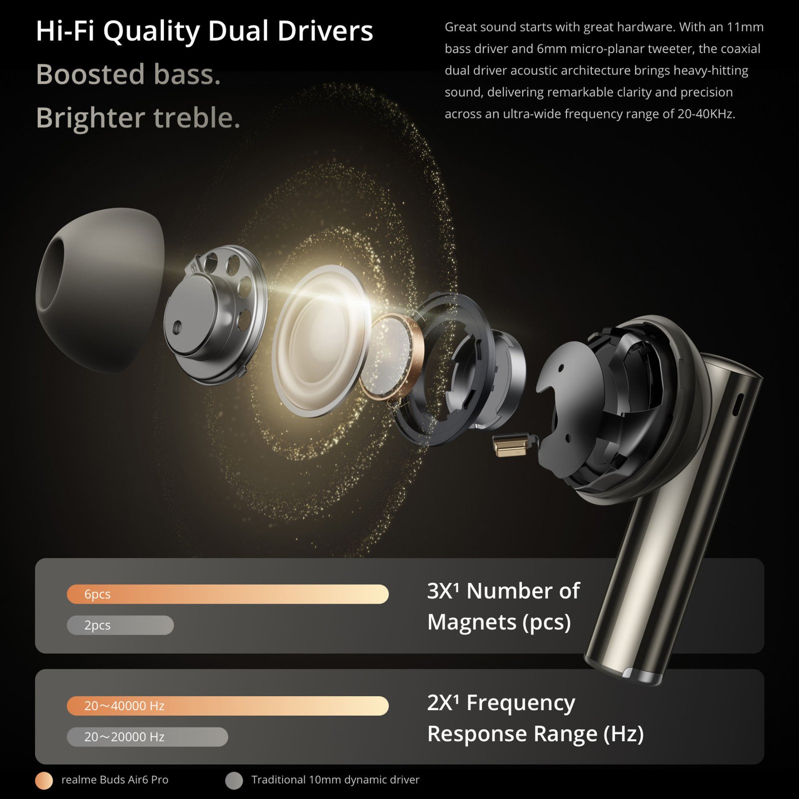 Realme pairs a Hi-Fi-level coaxial dual-driver setup — an 11 mm woofer and a 6 mm micro-planar tweeter — with Hi-Res-certified LDAC audio streaming for rich, detailed sound across bass, mids, and highs. The inclusion of a 3D spatial sound effect further enhances immersion for music, movies, and games.