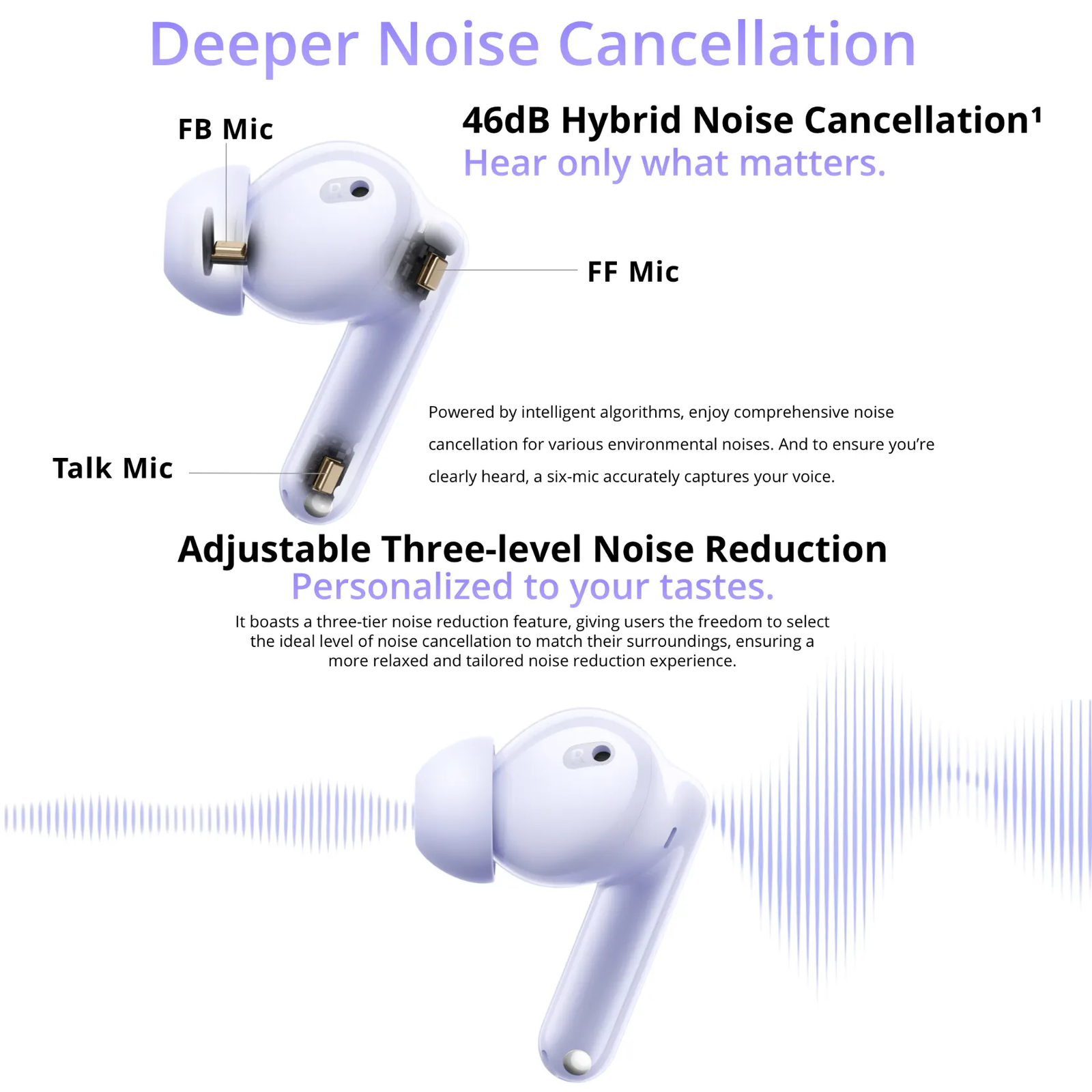 With ~45 ms ultra‑low latency mode, audio and visuals stay in sync for smoother gaming and video experiences on compatible devices. Six‑microphone AI call noise cancellation improves voice clarity during calls by reducing background noise.